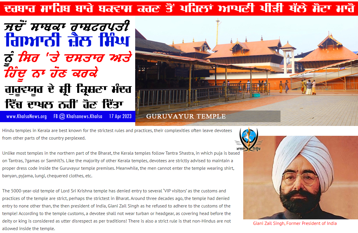 ਗਿਆਨੀ ਜ਼ੈਲ ਸਿੰਘ ਨੂੰ ਗੁਰੂਵਯੂਰ ਸ਼੍ਰੀ ਕ੍ਰਿਸ਼ਨਾ ਮੰਦਰ ਵਿੱਚ ਦਾਖਲ ਨਹੀਂ ਹੋਣ ਦਿੱਤਾ