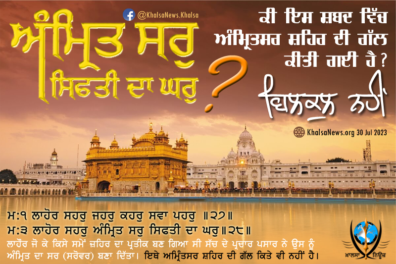 ਸਹਰੁ ਅੰਮ੍ਰਿਤ ਸਰੁ ਸਿਫਤੀ ਦਾ ਘਰੁ॥"