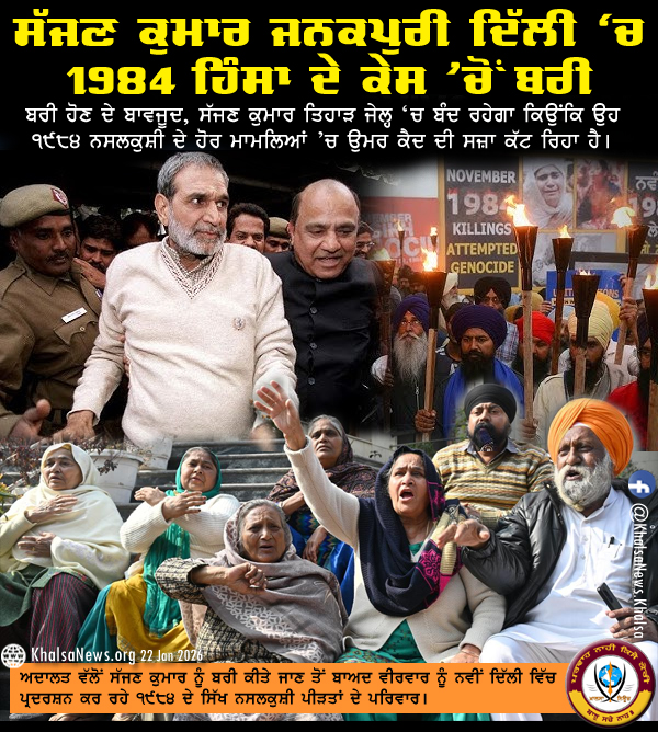 ▪️ ਬਰੀ ਹੋਣ ਦੇ ਬਾਵਜੂਦ, ਸੱਜਣ ਕੁਮਾਰ ਤਿਹਾੜ ਜੇਲ੍ਹ ਵਿੱਚ ਬੰਦ ਰਹੇਗਾ