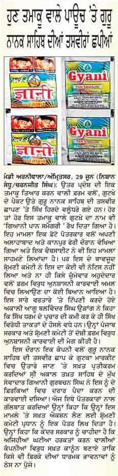 * ‘ਤਮਾਕੂ ਦੀ ਪੁੜੀ ’ਤੇ ਗੁਰੂ ਨਾਨਕ ਸਾਹਿਬ ਦੀ ਫ਼ੋਟੋ ਛਾਪਣ ਵਾਲੀ ਕੰਪਨੀ