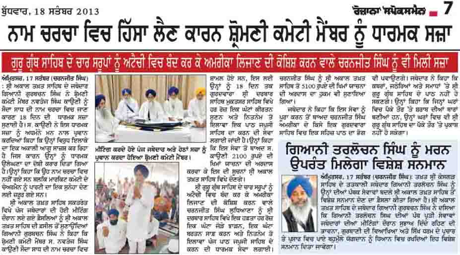 ਕਰਨ ਕਰਕੇ, ਧਾਰਮਿਕ ਸਜਾ ਸੁਨਾਈ ਅਤੇ ਤਨਖਾਹ ਲਗਾਈ ਹੈ। (ਧਾਰਮਿਕ ਸਜ਼ਾ ਵਿਚ ਨਵਤੇਜ ਸਿੰਘ