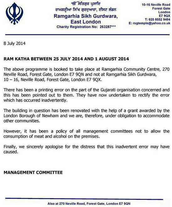 ਰਾਮਗੜ੍ਹੀਆ ਗੁਰਦੁਆਰਾ ਲੰਡਨ ਦੇ ਪ੍ਰਬੰਧਕਾਂ ਵਲੋਂ ਸਪਸ਼ਟੀਕਰਣ
