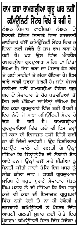 ਜੇ ਰਾਮਗੜ੍ਹੀਆ ਗੁਰਦੁਆਰਾ ਲੰਡਨ ਵਿਖੇ ਰਾਮ ਕਥਾ ਦੀ ਖ਼ਬਰ ਨਸ਼ਰ ਨਾ ਹੁੰਦੀ ਤਾਂ, ਇਹ ਕੰਮ ਹੋ ਜਾਣਾ ਸੀ, ਹੁਣ ਭਾਂਵੇਂ ਜੋ ਮਰਜ਼ੀ ਬਹਾਨਾ ਮਾਰ ਲਿਆ ਜਾਵੇ, ਅੱਜ ਕਲ ਗੁਰਦੁਆਰਿਆਂ (ਗੋਲਕਦੁਆਰਿਆਂ) ਲਈ ਪੈਸਾ ਪ੍ਰਧਾਨ ਹੈ, ਗੁਰਮਤਿ ਸਿਧਾਂਤ ਨਹੀਂ। ਖੈਰ, ਪ੍ਰਬੰਧਕਾਂ ਵਲੋਂ ਜੋ ਸਪਸ਼ਟੀਕਰਣ ਦਿੱਤਾ ਗਿਆ ਹੈ, ਉਹ ਇਸ ਪ੍ਰਕਾਰ ਹੈ: