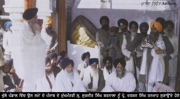 ਮੁੱਖ ਮੰਤਰੀ ਸੁਰਜੀਤ ਸਿੰਘ ਬਰਨਾਲਾ ਨੂੰ ਖੁੱਲੇ ਪੰਡਾਲ 'ਚ ਤਲਬ ਕੀਤਾ ਗਿਆ,
