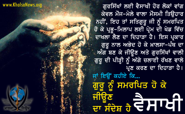 ਦਿਹਾੜਾ ਹੈ । ਜਾਂ ਇਉਂ ਕਹੀਏ ਕਿ ਗੁਰੂ ਨੂੰ ਸਮਰਪਿਤ ਹੋ ਕੇ ਜੀਊਣ ਦਾ ਸੰਦੇਸ਼ ਹੈ ਵੈਸਾਖੀ।