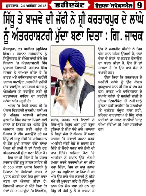 ਨਿਊਯਾਰਕ 24 ਅਗਸਤ (ਮਨਜੀਤ ਸਿੰਘ) ਭਾਰਤ ਤੇ ਪਾਕਿਸਤਾਨ ਦਾ ਸਰਹੱਦੀ ਤਣਾਉ ਘਟਾਉਣ, ਸਰਬਪੱਖੀ ਦੁਵੱਲੀ ਸਾਂਝ ਵਧਾਉਣ ਤੇ ਖ਼ਾਸ ਕਰਕੇ ਪੰਜਾਬ ਨੂੰ ਐਟਮੀ ਮਾਰ ਤੋਂ ਬਚਾਉਣ ਲਈ ਸ੍ਰੀ ਕਰਤਾਰਪੁਰ ਸਾਹਿਬ ਦਾ ਸਰਹੱਦੀ ਲਾਂਘਾ ਅਤਿ ਅਵਸ਼ਕ ਹੈ । ਅਸਲ ਵਿੱਚ ਇਹੀ ਕਾਰਣ ਸੀ ਕਿ ਮਹਿਰੂਮ ਅਕਾਲੀ ਜਥੇਦਾਰ ਸ੍ਰ. ਕੁਲਦੀਪ ਸਿੰਘ ਤੇ ਸ੍ਰੀ ਕੁਲਦੀਪ ਨਯੀਅਰ 1992 ਤੋਂ ਨਿਰੰਤਰ ਹਰ ਮਹੀਨੇ ਉਥੇ ਅਰਦਾਸ ਕਰਨ ਲਈ ਪਹੁੰਚ ਕੇ ਪਿਆਰ ਦੇ ਦੀਪਕ ਜਗਾਉਂਦੇ ਰਹੇ । ਪਰ ਸਿੱਧੂ ਦੀ ਜਾਦੂ ਜੱਫ਼ੀ ਤੇ ਪਾਕਿ ਦੇ ਫ਼ੌਜੀ ਮੁਖੀ ਬਾਜਵਾ ਵੱਲੋਂ ਲਾਂਘਾ ਖੋਲ੍ਹਣ ਦੀ ਹਾਮੀ ਨੇ ਤਾਂ ਇਸ ਨੂੰ ਹੁਣ ਅੰਤਰਾਸ਼ਟਰੀ ਮੁਦਾ ਬਣਾ ਦਿੱਤਾ ਹੈ । ਇਸੇ ਦਾ ਹੀ ਸਿੱਟਾ ਹੈ ਕਿ ਪੰਜਾਬ ਸਰਕਾਰ ਵੱਲੋਂ ਸ੍ਰੀ ਗੁਰੂ ਨਾਨਕ ਸਾਹਿਬ ਜੀ ਦੇ 550ਸਾਲਾ ਪ੍ਰਕਾਸ਼ ਦਿਹਾੜੇ ਨੂੰ ਧਿਆਨ ਵਿੱਚ ਰਖਦਿਆਂ ਭਾਰਤ ਦੇ ਪ੍ਰਧਾਨ ਮੰਤ੍ਰੀ ਨਾਲ ਇਹ ਮੁੱਦਾ ਸਾਂਝਾ ਕਰਨ ਦਾ ਐਲਾਨ ਕੀਤਾ ਹੈ । ਇਹ ਵਿਚਾਰ ਹਨ ਅੰਤਰਾਸ਼ਟਰੀ ਸਿੱਖ ਪ੍ਰਚਾਰਕ ਗਿ. ਜਗਤਾਰ ਸਿੰਘ ਜਾਚਕ ਦੇ, ਜੋ ਉਨ੍ਹਾਂ ਨਿਊਯਾਰਕ ਤੋਂ ਭੇਜੇ ਪ੍ਰੈਸ-ਨੋਟ ਰਾਹੀਂ ਕਹੇ ।