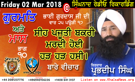🦁 ਰੇਡੀਓ ਸਿੰਘਨਾਦ 'ਤੇ ਸਿਰਦਾਰ ਪ੍ਰਭਦੀਪ ਸਿੰਘ ਦੇ ਵੀਚਾਰ 02 ਮਾਰਚ 2018 "ਸੀਹ ਪਜੂਤੀ ਬਕਰੀ ਮਰਦੀ ਹੋਈ ਹੜ ਹੜ ਹਸੀ।" - ਭਾਈ ਗੁਰਦਾਸ ਵਾਰ 25, ਪਉੜੀ 17 ਗੁਰਮਤਿ ਅਤੇ ਮਾਸ ਦਾ ਅਖੀਰਲਾ ਭਾਗ