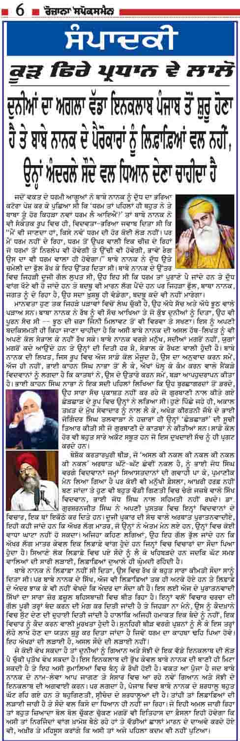 ਐਡੀਟਰ ਸਾਹਿਬ ਇਸੇ ਸੰਪਾਦਕੀ ਵਿਚ ਲਿਖਦੇ ਹਨ “ਬਾਬੇ ਨਾਨਕ ਨੇ ਲਿਫਾਫਾ ਨਹੀਂ
