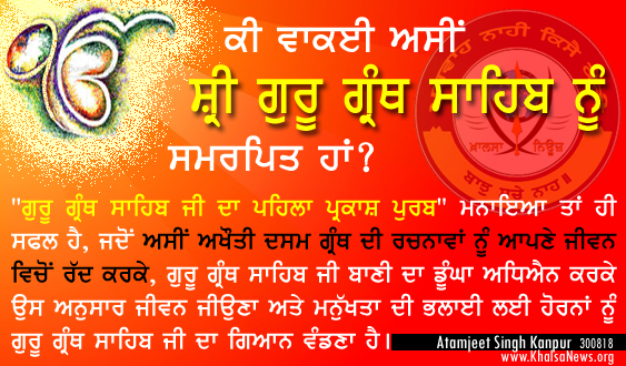 ਸਮੁੱਚਾ ਸਿੱਖ ਜਗਤ ਮੂਲ ਨਾਨਕਸ਼ਾਹੀ ਕੈਲੰਡਰ ਅਨੁਸਾਰ ੧ ਸਿਤੰਬਰ ਨੂੰ "ਗੁਰੂ ਗ੍ਰੰਥ ਸਾਹਿਬ ਜੀ ਦਾ ਪਹਿਲਾ ਪ੍ਰਕਾਸ਼ ਪੁਰਬ" ਮਨਾ ਰਿਹਾ ਹੈ, ਉਨ੍ਹਾਂ ਵੀਰਾਂ ਅਤੇ ਭੈਣਾਂ ਲਈ ਇੱਕ ਹੋਕਾ ... "ਕੀ ਵਾਕਈ ਅਸੀਂ ਸਿਰਫ਼ ਗੁਰੂ ਗ੍ਰੰਥ ਸਾਹਿਬ ਜੀ ਨੂੰ ਸਮਰਪਤਿ ਹਾਂ"?