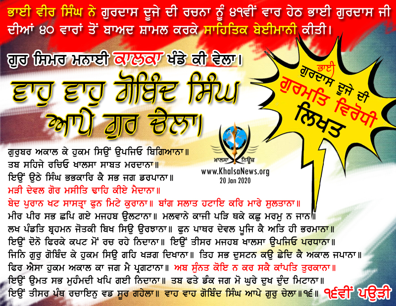 ਹੈ ਕਿ ਇਹ ਵਾਰ ਨਿਰੋਲ ਗੁਰਮਤਿ ਵਿਰੋਧੀ ਹੈ ਤੇ ਕਿਸੇ ਪੰਥ ਦੋਖੀ ਤਾਕਤ (ਲੇਖਕ) ਦੀ ਲਿਖੀ ਹੋਈ