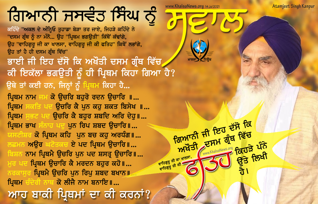ਜਾਏ, ਜਿਹੜੇ ਕਹਿੰਦੇ ਨੇ "ਦਸਮ {ਅਖੌਤੀ ਦਸਮ ਗ੍ਰੰਥ} ਨੂੰ ਨਾ ਮੰਨੋ ਉਹ "ਪ੍ਰਿਥਮ ਭਗਉਤੀ"