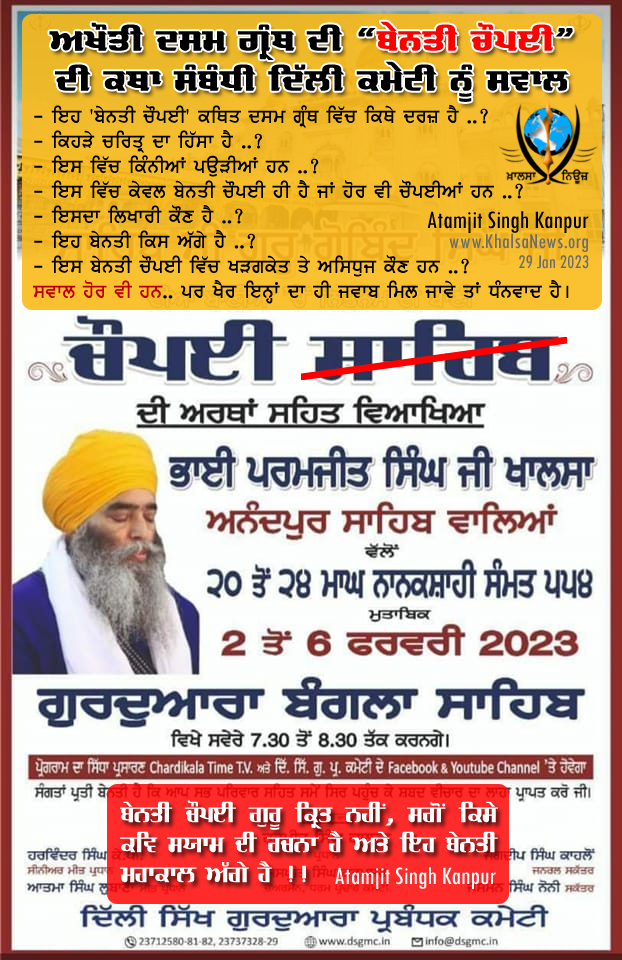 ਗ੍ਰੰਥ ਦੀ "ਬੇਨਤੀ ਚੌਪਈ" ਦੀ ਕਥਾ ਸੰਬੰਧੀ ਦਿੱਲੀ ਕਮੇਟੀ ਨੂੰ ਬੇਨਤੀ
