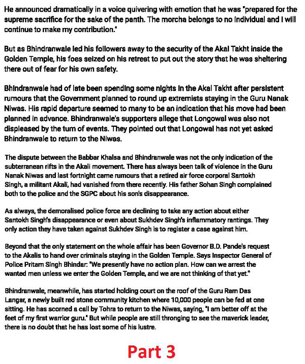 - ਇਸਦੇ ਨਤੀਜੇ ਵਜੋਂ ਭਿੰਡਰਾਂਵਾਲਿਆਂ ਨੇ ਆਪਣੇ ਜਥੇ ਨਾਲ ਅਕਾਲ ਤਖਤ 'ਤੇ ਜਾ ਡੇਰੇ ਲਾਏ।
