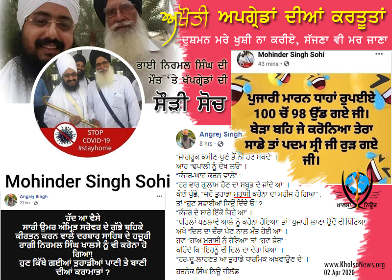 ਇਹ ਪੰਜਾਬੀ ਦਾ ਮਸ਼ਹੂਰ ਅਖਾਣ ਹੈ, ਠੀਕ ਵਿਚਾਰਾਂ ਦਾ ਵਖਰੇਵਾਂ ਹੋ ਸਕਦਾ ਕੁਝ ਜਾਤੀ ਨਫਰਤ ਹੋ ਸਕਦੀ ਹੈ... ਪਰ ਭਾਈ ਨਿਰਮਲ ਸਿੰਘ ਦੇ ਅਕਾਲ ਚਲਾਣੇ 'ਤੇ ਇਹੋ ਜਿਹੀਆਂ ਪੋਸਟਾਂ ਬੇਅਕਲੀ ਦਾ ਸਬੂਤ ਦੇਂਦੀਆਂ ਨੇ।