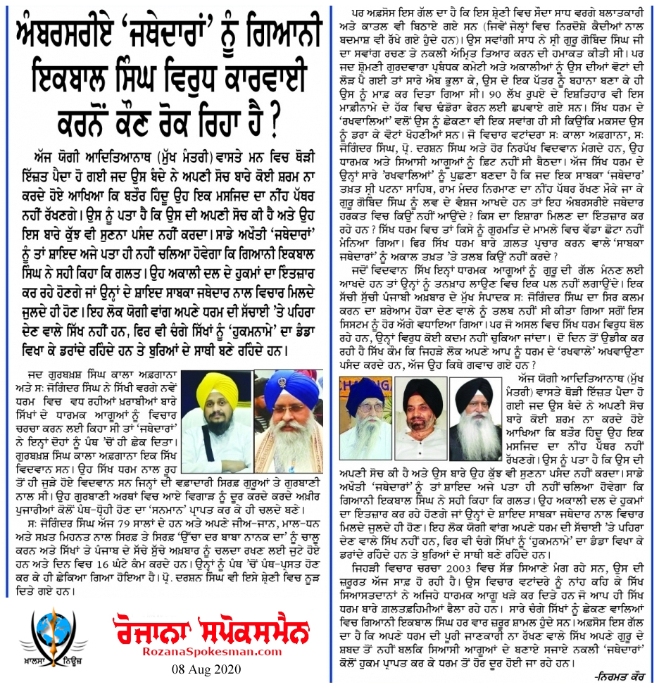 #KhalsaNews #ProfDrashanSingh #KalaAfghana #RozanaSpokesman #JoginderSingh #IqbalSingh #RSS