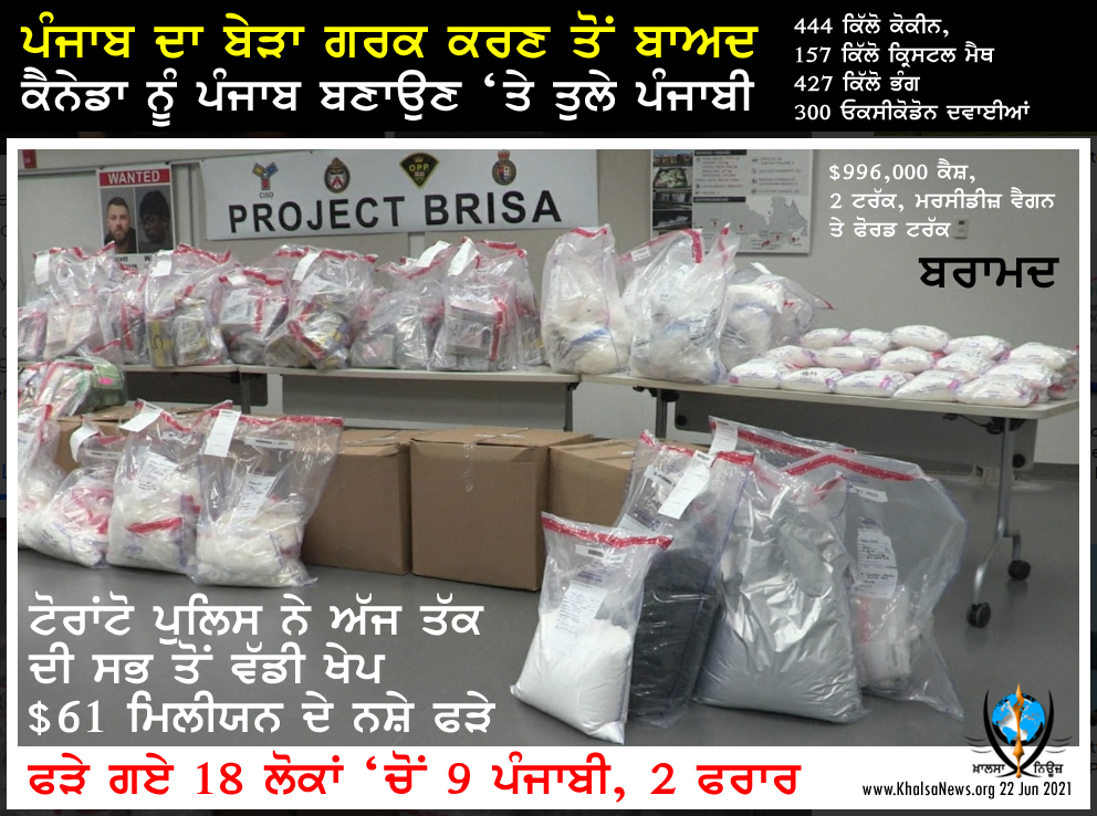 ਭੰਗ, 300 ਕਿੱਲੋ ਔਕਸੀਕੋਡੋਨ ਗੋਲੀਆਂ, $966,020 ਕੈਨੇਡੀਅਨ ਡਾਲਰ, 21 ਗੱਡੀਆਂ ਜਿਨ੍ਹਾਂ