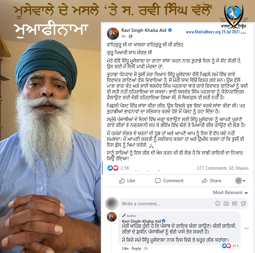 ਮੂਸੇਵਾਲੇ ਵਾਲੀ ਪੋਸਟ ਹਟਾ ਦਿੱਤੀ ਹੈ ਤੇ ਇਹ ਮੁਆਫੀਨਾਮਾ ਪੋਸਟ ਕੀਤਾ ਹੈ।