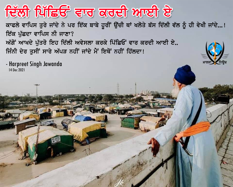 ਕਾਫਲੇ ਵਾਪਿਸ ਤੁਰੇ ਜਾਂਦੇ ਨੇ ਪਰ ਇੱਕ ਬਾਬੇ ਹੂਰੀ ਉਚੀ ਥਾਂ ਖਲੋਤੇ ਬੱਸ ਦਿੱਲੀ ਵੱਲ