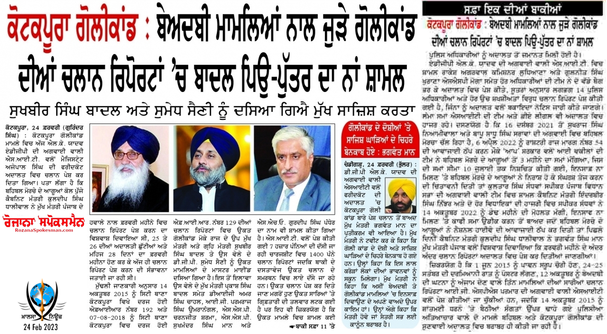 ਚਲਾਨ ਵਿੱਚ ਪ੍ਰਕਾਸ਼ ਬਾਦਲ, ਸੁਖਬੀਰ ਬਾਦਲ, ਸਾਬਕਾ DGP ਸੁਮੇਧ ਸੈਣੀ, ਸਾਬਕਾ DIG