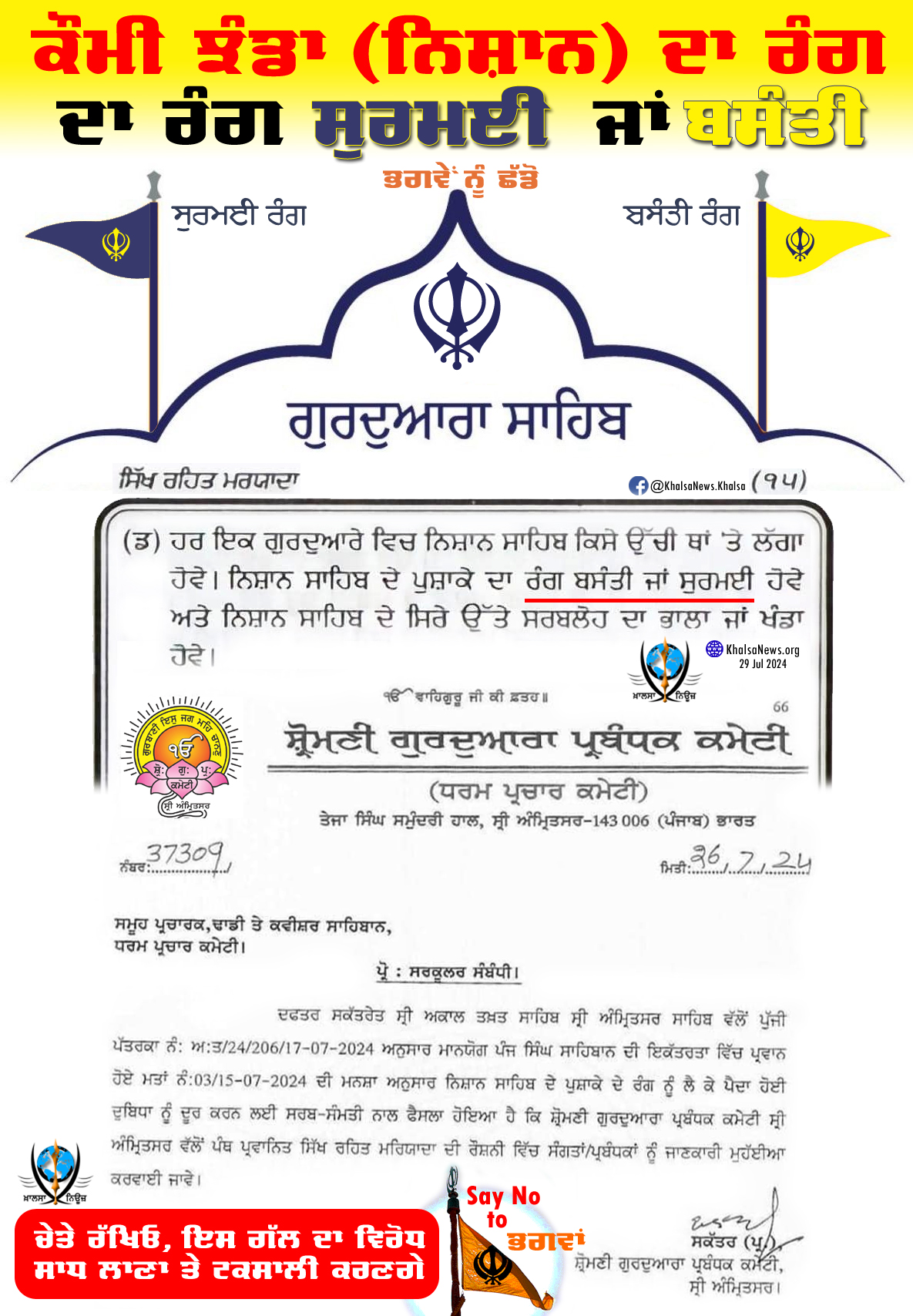 🚩 ਸਨਾਤਨੀਆਂ ਦੇ ਪ੍ਰਭਾਵ ਹੇਠ ਕੌਮੀ ਨਿਸ਼ਾਨ ਦਾ ਰੰਗ "ਬਸੰਤੀ"