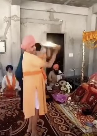 ਥਾਲੀ ਗੁਰੂ ਗ੍ਰੰਥ ਸਾਹਿਬ ਅੱਗੇ ਘੁਮਾ ਰਿਹਾ ਹੈ।