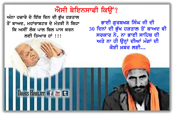 ਸਿੰਘ ਦੀ ਭੁੱਖ ਹੜਤਾਲ ਨੂੰ ਤੋਲ ਕੇ ਦੁੱਖੀ ਹੋ ਰਹੇ ਹੋਂ। ਅੰਨਾ ਹਜਾਰੇ ਨੂੰ ਛਿੱਕ ਵੀ