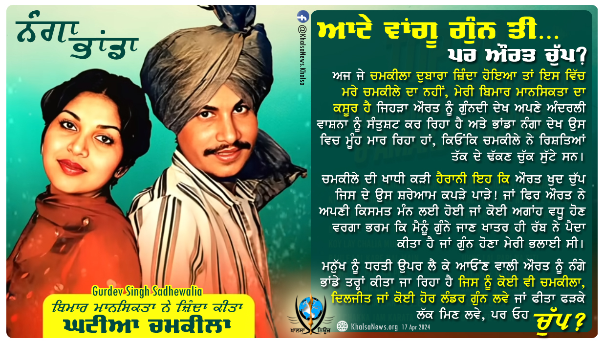 ⛔ ਚਮਕੀਲੇ ਦੀ ਖਾਧੀ ਕੜੀ ਹੈਰਾਨੀ ਇਹ ਕਿ ਔਰਤ ਖੁਦ ਚੁੱਪ ਜਿਸ ਦੇ ਉਸ ਸ਼ਰੇਆਮ ਕਪੜੇ ਪਾੜੇ।