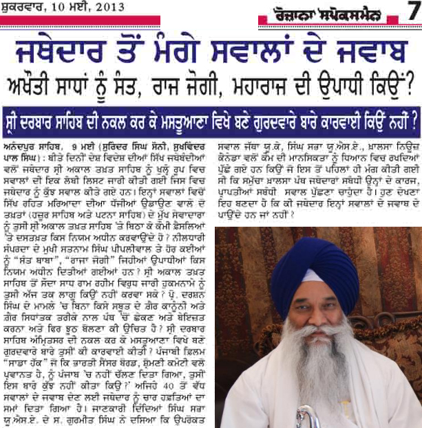ਕਰਦੇ ਰਹਿਣਗੇ। ਕੁੱਝ ਸਵਾਲ ਰੋਜ਼ਾਨਾ ਸਪੋਕਸਮੈਨ ਅਖਬਾਰ ਨੇ ਵੀ ਖਬਰ ਦੇ ਰੂਪ ਵਿੱਚ