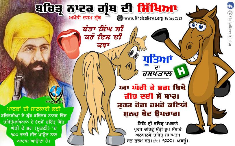 ਗੁਰੂ ਇਕ ਅਨੋਖਾ ਇਲਾਜ ਦਸ ਰਿਹਾ ਹੈ । ਕੋਈ ਵੀ ਰੋਗ ਹੋਵੇ ਘੋੜੀ ਦੀ ਮੂਤਨੀ ਵਿੱਚ ਸੌ