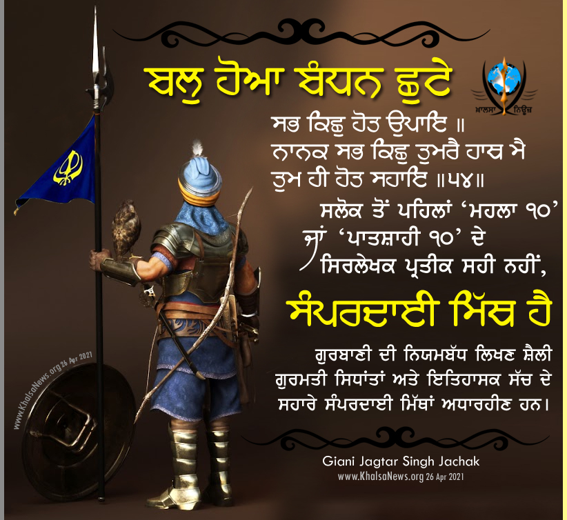 ਉਨ੍ਹਾਂ ‘ਬਲ ਹੋਆ ਬੰਧਨ ਛੁਟੇ…॥” ਦੋਹਰਾ ਉਚਾਰਨ ਕੀਤਾ । ਇਸ ਲਈ ਸਿਰਲੇਖ ਮਹਲਾ 10 ਹੈ ।