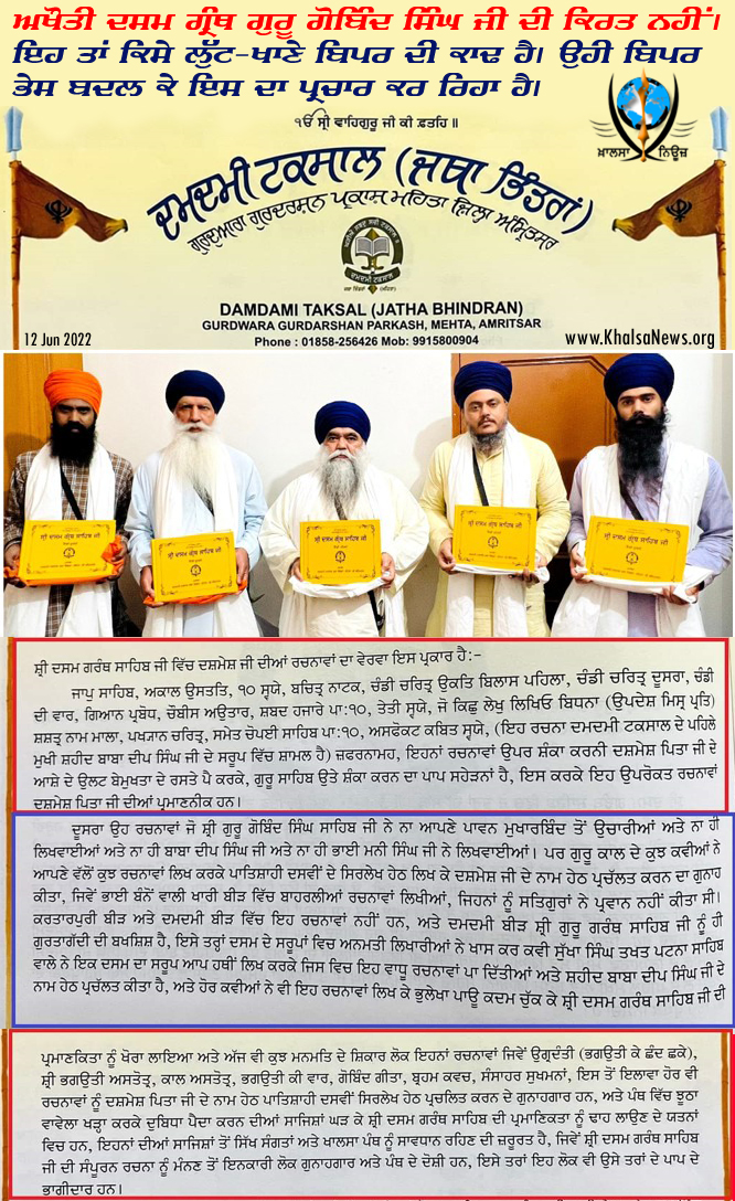 ਧੁੰਮਾ ਵੱਲੋਂ ਦਸਮ ਗ੍ਰੰਥ ਦੀਆਂ ਦੋ ਪੋਥੀਆਂ, 12 ਜੂਨ 2022 ਦਿਨ ਐਤਵਾਰ ਨੂੰ