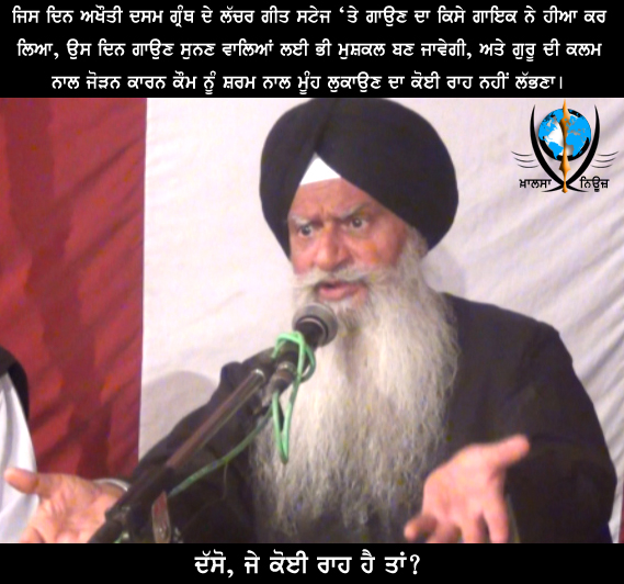 ਮੈਂ ਕੌਮ ਨੂੰ ਇੱਕ ਚੇਤਾਵਨੀ ਦੇਣਾ ਚਾਹੁੰਦਾ ਹਾਂ, ਜਿਹੜੇ ਲੱਚਰ ਗੀਤ ਹੁਣ ਸਟੇਜਾਂ ‘ਤੇ ਗਾਏ ਜਾ ਰਹੇ ਹਨ, ਉਹ ਤਾਂ ਕੁਛ ਅਸੱਭਯ ਔਰਤਾਂ ਮਰਦ ਸੁਣ ਹੀ ਲੈਂਦੇ ਹਨ, ਪਰ ਯਾਦ ਰੱਖੋ ਜਿਸ ਦਿਨ ਉਸ ਗ੍ਰੰਥ ਦੇ ਲੱਚਰ ਗੀਤ ਸਟੇਜ ‘ਤੇ ਗਾਉਣ ਦਾ ਕਿਸੇ ਗਾਇਕ ਨੇ ਹੀਆ ਕਰ ਲਿਆ, ਉਸ ਦਿਨ ਗਾਉਣ ਸੁਨਣ ਵਾਲਿਆਂ ਲਈ ਭੀ ਮੁਸ਼ਕਲ ਬਣ ਜਾਵੇਗੀ, ਅਤੇ ਗੁਰੂ ਦੀ ਕਲਮ ਨਾਲ ਜੋੜਨ ਕਾਰਨ ਕੌਮ ਨੂੰ ਸ਼ਰਮ ਨਾਲ ਮੂੰਹ ਲੁਕਾਉਣ ਦਾ ਕੋਈ ਰਾਹ ਨਹੀਂ ਲੱਭਣਾ।
