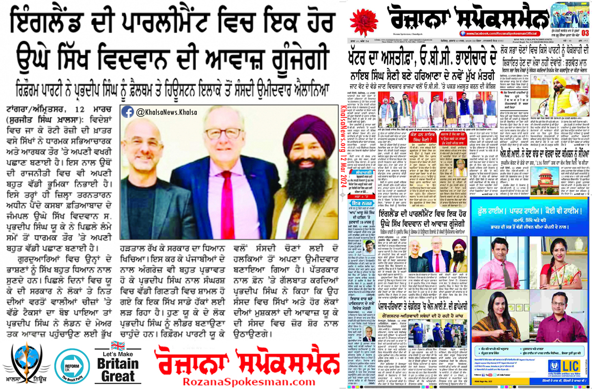 ਸਿਰਦਾਰ ਪ੍ਰਭਦੀਪ ਸਿੰਘ ਨੂੰ ਯੁ.ਕੇ. ਦੀ ਰਿਫੌਰਮ ਪਾਰਟੀ ਨੇ ਫੈਲਥਮ ਤੇ ਹੇਸਟਨ ਇਲਾਕੇ