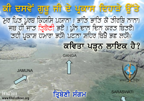 ਕਵਿਤਾ ਕਹਿੰਦੀ ਹੈ ਕਿ ਨੌਵੇਂ ਗੁਰੂ ਜੀ ਨੇ ਤ੍ਰਿਬੇਣੀ (ਪ੍ਰਯਾਗ, ਅਲਾਹਾਬਾਦ) ਦੇ ਅਸਥਾਨ