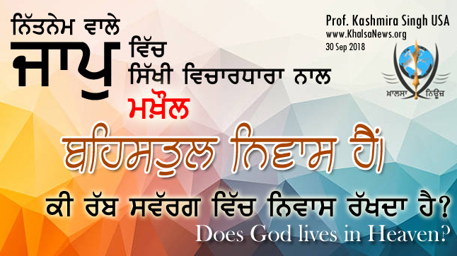 ਹੈ ਭਾਵ, ਹੇ ਰੱਬ ਜੀ ਤੂੰ ਸਵੱਰਗ ਦਾ ਵਾਸੀ ਹੈਂ। ਇਹ ਸਿੱਖੀ ਵਿਚਾਰਧਾਰਾ ਦੇ ਉਲ਼ਟ ਹੈ।