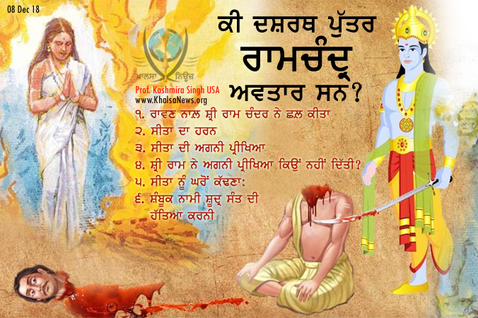 ਅਗਨੀ ਪ੍ਰੀਖਿਆ ਲੈ ਕੇ ਵੀ ਸ਼੍ਰੀ ਰਾਮ ਨੂੰ ਸੀਤਾ ਉੱਤੇ ਪੂਰਾ ਵਿਸ਼ਵਾਸ ਨਹੀਂ ਸੀ ।ਇੱਕ ਧੋਬੀ ਦੇ ਮਿਹਣਾ ਦੇਣ ਉੱਤੇ ਕਿ ਸੀਤਾ ਪਰਾਏ ਮਰਦ ਕੋਲ਼ ਰਹਿ ਕੇ ਆਈ ਹੈ ਪਰ ਸ਼੍ਰੀ ਰਾਮ ਨੇ ਘਰ ਵਸਾ ਲਈ ਹੈ, ਸੀਤਾ ਨੂੰ ਘਰੋਂ ਕੱਢ ਦਿੱਤਾ ਗਿਆ । ਜੇ ਸ਼੍ਰੀ ਰਾਮ ਚੰਦਰ ਅਵਤਾਰ ਹੁੰਦੇ ਤਾਂ ਉਨ੍ਹਾਂ ਨੂੰ ਧੋਬੀ ਦੇ ਮਾਰੇ ਮਿਹਣੇ ਦੇ ਸੱਚ ਝੂਠ ਦਾ ਪਤਾ ਹੋਣਾ ਚਾਹੀਦਾ ਸੀ । ਧੋਬੀ ਨੂੰ ਢੁੱਕਵਾਂ ਉੱਤਰ ਦੇਣ ਦੀ ਵਜਾਇ ਆਪਣੀ ਗਰਭਵਤੀ ਸਾਥਣ ਨੂੰ ਘਰੋਂ ਕੱਢ ਕੇ ਜੰਗਲ ਬੀਆਵਾਨ ਵਿੱਚ ਛੱਡ ਆਉਣਾ ਕੀ ਸ਼੍ਰੀ ਰਾਮ ਚੰਦਰ ਨੂੰ ਅਵਤਾਰ ਬਣਉਂਦਾ ਹੈ? ਕੀ ਇਹ ਇਸਤਰੀ ਜਾਤੀ ਦਾ ਘੋਰ ਅਪਮਾਨ ਨਹੀਂ ? ਜੇ ਅਜਿਹਾ ਹੀ ਕਰਨਾ ਸੀ ਤਾਂ ਸੀਤਾ ਦੀ ਅਗਨੀ ਪ੍ਰੀਖਿਆ ਕਿੱਸ ਵਾਸਤੇ ਕੀਤੀ ਸੀ? ਰਾਵਣ ਨੇ ਤਾਂ ਸੀਤਾ ਦੀ 3 ਸਾਲ ਰੱਖਿਆ ਕੀਤੀ ਅਤੇ ਸਾਰੀਆਂ ਸਹੂਲਤਾਂ ਦਿੱਤੀਆਂ ਪਰ ਰਾਮ ਨੇ ਉਸ ਨੂੰ ਇੱਕ ਧੋਬੀ ਦੇ ਕਹਿਣ ਉੱਤੇ ਘਰੋਂ ਹੀ ਕੱਢ ਦਿੱਤਾ । ਜੇ ਰਿਸ਼ੀ ਬਾਲਮੀਕ ਸੀਤਾ ਨੂੰ ਆਪਣੀ ਕੁਟੀਆ ਵਿੱਚ ਨਾ ਲੈ ਜਾਂਦਾ ਤਾਂ ਭਿਆਨਕ ਜੰਗਲ ਵਿੱਚ ਸੀਤਾ ਦਾ ਕੀ ਬਣਦਾ? ਸ਼੍ਰੀ ਰਾਮ ਨੂੰ ਬਨਵਾਸ ਮਿਲ਼ਿਆ ਸੀ ਤਾਂ ਸੀਤਾ ਨੇ ਨਾਲ਼ ਜਾ ਕੇ ਪੂਰਾ ਸਾਥ ਦਿੱਤਾ ਸੀ । ਸੀਤਾ ਨੂੰ ਇਕੱਲੀ ਨੂੰ ਬਨਵਾਸ ਦਿੱਤਾ ਗਿਆ ਪਰ ਕੋਈ ਸਾਥੀ ਨਹੀਂ । ਕੀ ਸ਼੍ਰੀ ਰਾਮ ਨੂੰ ਆਪਣੀ ਪਤਨੀ ਨਾਲ਼ ਅਜਿਹਾ ਸਲੂਕ ਕਰਨ ਤੇ ਫਿਰ ਵੀ ਅਵਤਾਰ ਕਹਿਣਾ ਠੀਕ ਹੈ?