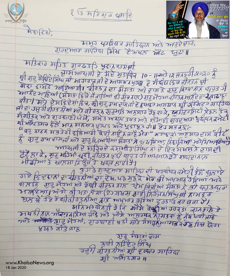 14 ਜਨਵਰੀ 2020 ਨੂੰ ਪ੍ਰੋ. ਕਸ਼ਮੀਰਾ ਸਿੰਘ ਜੀ ਵੱਲੋਂ ਭਾਈ ਨਰਿੰਦਰ ਸਿੰਘ ਦੇ ਅਮਰੀਕਾ ਫੇਰੀ ਦੌਰਾਨ ਗੁਰੂ ਗੋਬਿੰਦ ਸਿੰਘ ਜੀ ਦੇ ਪ੍ਰਕਾਸ਼ ਪੁਰਬ ਮੌਕੇ ਅਖੌਤੀ ਦਸਮ ਗ੍ਰੰਥ ਦੀਆਂ ਰਚਨਾਵਾਂ ਗਾਉਣ ਬਾਰੇ ਖ਼ਾਲਸਾ ਨਿਊਜ਼ 'ਤੇ ਪੋਸਟ ਪਾਈ ਗਈ ਸੀ, ਜਿਸ ਬਾਰੇ ਭਾਈ ਨਰਿੰਦਰ ਸਿੰਘ ਵੱਲੋਂ ਗੁਰਦੁਆਰਾ ਪ੍ਰਬੰਧਕ ਕਮੇਟੀ ਯੂਟਾ ਅਮਰੀਕਾ ਨੂੰ ਪ੍ਰੋ. ਕਸ਼ਮੀਰਾ ਸਿੰਘ ਵਿੱਰੁਧ ਸ਼ਿਕਾਇਤ ਕੀਤੀ ਹੈ। ਇਹ ਹੈ ਇਨ੍ਹਾਂ ਰਾਗੀਆਂ ਦੀ ਔਕਾਤ, ਖਾਉਂਦੇ ਗੁਰੂ ਗ੍ਰੰਥ ਸਾਹਿਬ ਕਰਕੇ ਨੇ, ਪਰ ਮੁਰੀਦ ਇਹ ਅਖੌਤੀ ਦਸਮ ਗ੍ਰੰਥ ਦੇ ਹਨ। ਬਾਕੀ ਪਾਠਕ ਆਪ ਉਨ੍ਹਾਂ ਵੱਲੋਂ ਲਿਖਿਆ ਖ਼ਤ ਪੜ੍ਹ ਸਕਦੇ ਹਨ।