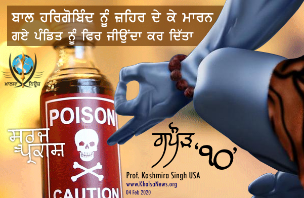 ਪੰਡਿਤ ਨੂੰ ਭਾਈ ਪ੍ਰਿਥੀ ਚੰਦ ਵਲੋਂ ਖ਼ੁਦ ਜ਼ਹਿਰ ਫੜਾ ਕੇ ਕਿਹਾ ਕਿ ਬਾਲ ਹਰਿਗੋਬਿੰਦ ਨੂੰ