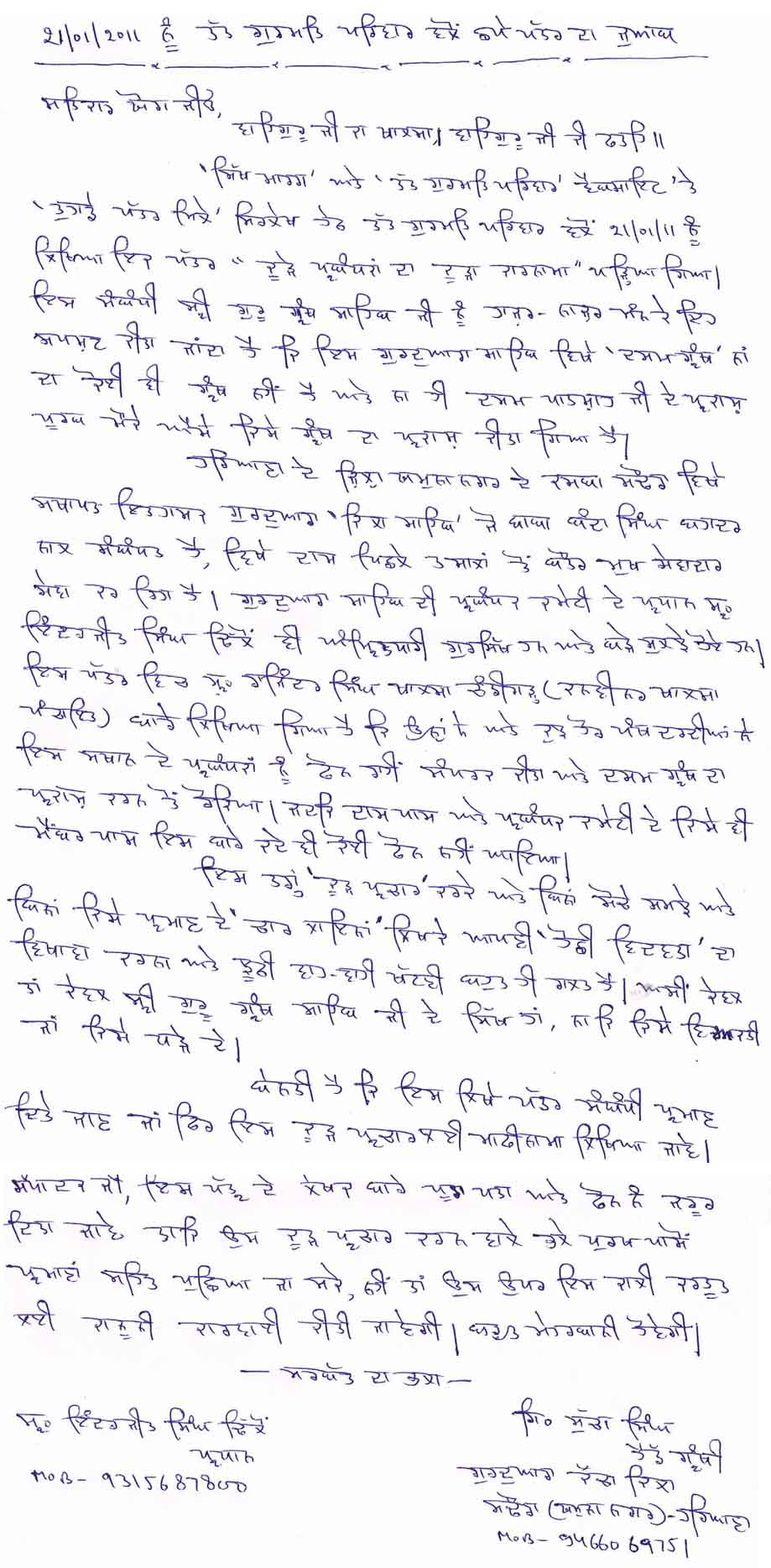ਪ੍ਰਬੰਧਕਾਂ ਦਾ ਇਕ ਪੱਤਰ ਸਾਡੇ ਤੱਕ ਪੁੱਜਿਆ ਹੈ, ਜਿਸ ਵਿਚ ਉਨ੍ਹਾਂ ਨੇ ਗੁਰੂ ਗ੍ਰੰਥ ਸਾਹਿਬ