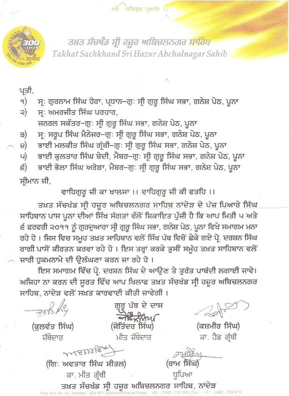ਅਖੌਤੀ ਜਥੇਦਾਰ ਨੇ ਅਕਾਲ ਤਖ਼ਤ ਦੇ ਲੈਟਰ ਪੈਡ ਨੂੰ, ਪ੍ਰੋ. ਦਰਸ਼ਨ ਸਿੰਘ ਖਾਲਸਾ ਦੇ ਕੀਰਤਨ ਸਮਾਗਮਾਂ ਨੂੰ ਰੋਕਣ ਲਈ ਵਰਤ ਕੇ, ਸਿੱਖੀ ਸਿਧਾਂਤਾਂ ਦੀਆਂ ਧੱਜੀਆਂ ਉਡਾਈਆਂ ਪ੍ਰੋ. ਦਰਸ਼ਨ ਸਿੰਘ ਖਾਲਸਾ ਦੇ ਕੀਰਤਨ ਸਮਾਗਮ ਨੂੰ ਬੰਦ ਕਰਾਉਣ ਲਈ ਭੇਜੇ ਗਏ ਲੈਟਰ, ਜਿਨ੍ਹਾਂ ਦੀ ਪਰਵਾਹ ਨਾ ਕਰਦੇ ਹੋਏ ਗਣੇਸ਼ ਪੇਠ ਗੁਰਦੁਆਰਾ, ਪੁਨੇ 'ਚ ਪ੍ਰੋਗ੍ਰਾਮ ਵੀ ਹੋਇਆ ਅਤੇ ਉਨ੍ਹਾਂ ਨੂੰ ਸਨਮਾਨਿਤ ਵੀ ਕੀਤਾ ਗਿਆ। ਓ ਜਥੇਦਾਰੋ, ਸ਼ਰਮ ਕਰੋ, ਇਸ ਤਰ੍ਹਾਂ ਦੀਆਂ ਹਰਕਤਾਂ ਨਾਲ ਕੁੱਝ ਨਹੀਂ ਜੇ ਸੰਵਰਨਾ। ਤੁਹਾਡੀ ਸਿੱਖ ਸੰਗਤ 'ਚ ਕੋਈ ਔਕਾਤ ਨਹੀਂ, ਤੁਸੀਂ ਇਨ੍ਹਾਂ ਧਾਰਮਿਕ ਪਦਵੀਆਂ ਦੀ ਵੀ ਮੱਹਤਤਾ ਘਟਾ ਦਿੱਤੀ ਹੈ।