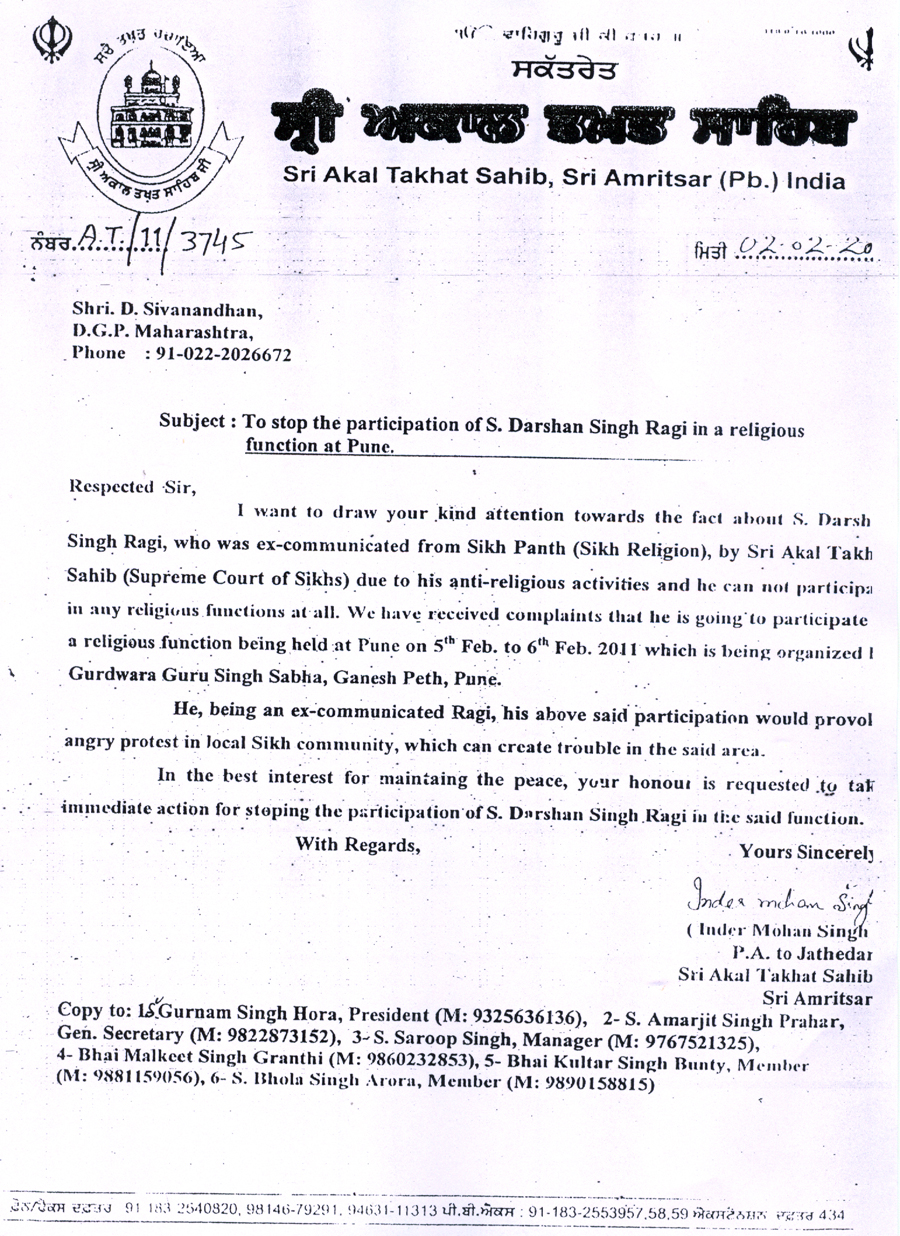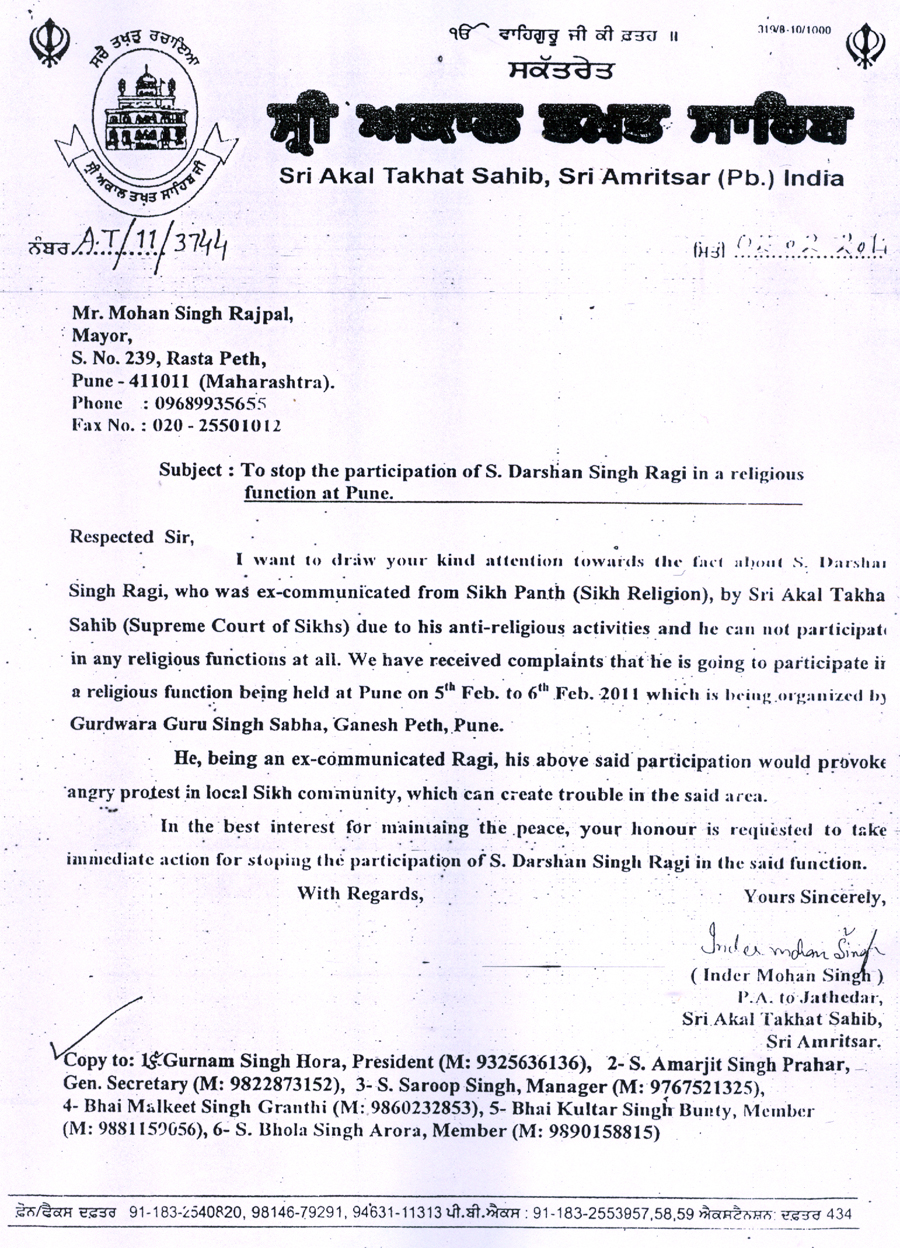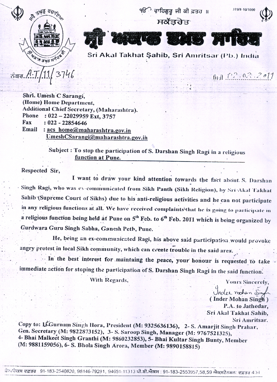 ਅਖੌਤੀ ਜਥੇਦਾਰ ਦੇ ਪੀ.ਏ. ਵਲੋਂ ਪ੍ਰੋ. ਦਰਸ਼ਨ ਸਿੰਘ ਖਾਲਸਾ ਦੇ ਪੂਨੇ ਵਿਖੇ ਕੀਰਤਨ ਸਮਾਗਮ ਰੋਕਣ ਲਈ ਮਹਾਰਾਸ਼ਟਰ ਦੇ ਵੱਖ ਵੱਖ ਅਧਿਕਾਰੀਆਂ ਨੂੰ ਲੇਲੜੀਆਂ ਕੱਢਦੇ ਬੇਨਤੀ ਪੱਤਰ