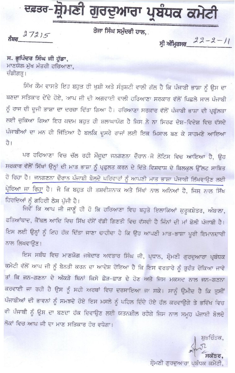 ਮੱਕੜ ਦੀ ਮੱਕਾਰੀ, ਇੱਕ ਪਾਸੇ ਹਰਿਆਣਾ ਦੇ ਮੁੱਖ ਮੰਤ੍ਰੀ ਹੁੱਡਾ ਨੂੰ ਪੰਜਾਬੀ ਨੂੰ ਦੂਜੀ ਭਾਸ਼ਾ ਦੇ ਲਾਗੂ ਕਰਨ ਦੀ ਵਧਾਈ, ਦੂਜੇ ਪਾਸੇ ਸਿੱਖਾਂ ਨੂੰ ਜਨਗਣਨਾ ਸਮੇਂ ਪੰਜਾਬੀ ਲਿਖਵਾਉਣ ਲਈ ਰੋਕਣ ਦੀ ਅਪੀਲ ਅਜਿਹਾ ਕਰਕੇ ਮੱਕੜ ਨੇ ਹਰਿਆਣੇ ਦੇ ਸਿੱਖਾਂ ਅਤੇ ਪੰਜਾਬੀ ਜ਼ੁਬਾਨ ਪ੍ਰਤੀ ਵਿਸ਼ਵਾਸ਼ਘਾਤ ਹੀ ਨਹੀਂ ਕੀਤਾ, ਸਗੋਂ ਮੱਕਾਰੀ ਅਤੇ ਕਮੀਨਗੀ ਦੀ ਤਸਵੀਰ ਵੀ ਪੇਸ਼ ਕੀਤੀ ਹੈ। ਲਓ ਪੜ੍ਹੋ, ਉਹ ਚਿੱਠੀ ਜੋ ਭੁਪਿੰਦਰ ਸਿੰਘ ਹੁੰਡਾ ਮੁੱਖ ਮੰਤਰੀ ਹਰਿਆਣਾ ਨੂੰ ਲਿਖੀ ਗਈ: