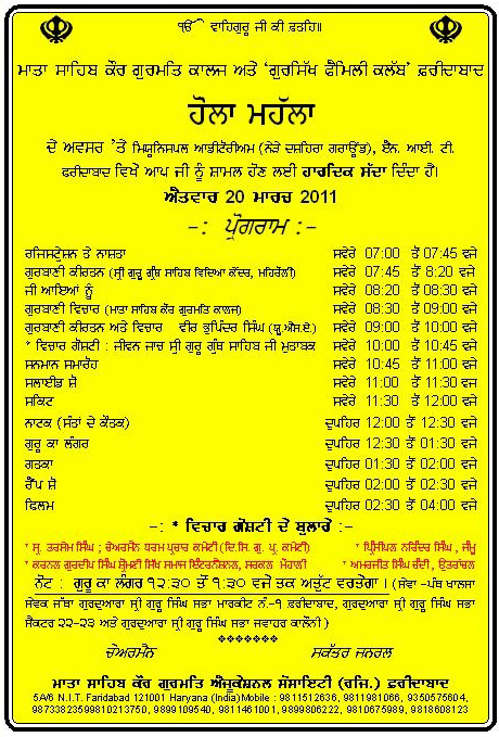 ਮਾਤਾ ਸਾਹਿਬ ਕੌਰ ਗੁਰਮਤਿ ਕਾਲੇਜ ਅਤੇ "ਗੁਰਸਿੱਖ ਫੈਮਿਲੀ ਕਲੱਬ" ਫ਼ਰੀਦਾਬਾਦ ਵਲੋਂ 20 ਮਾਰਚ 2011 ਨੂੰ ਹੋਲਾ ਮਹੱਲਾ ਦੇ ਅਵਸਰ 'ਤੇ ਗੁਰਮਤਿ ਸਮਾਗਮ