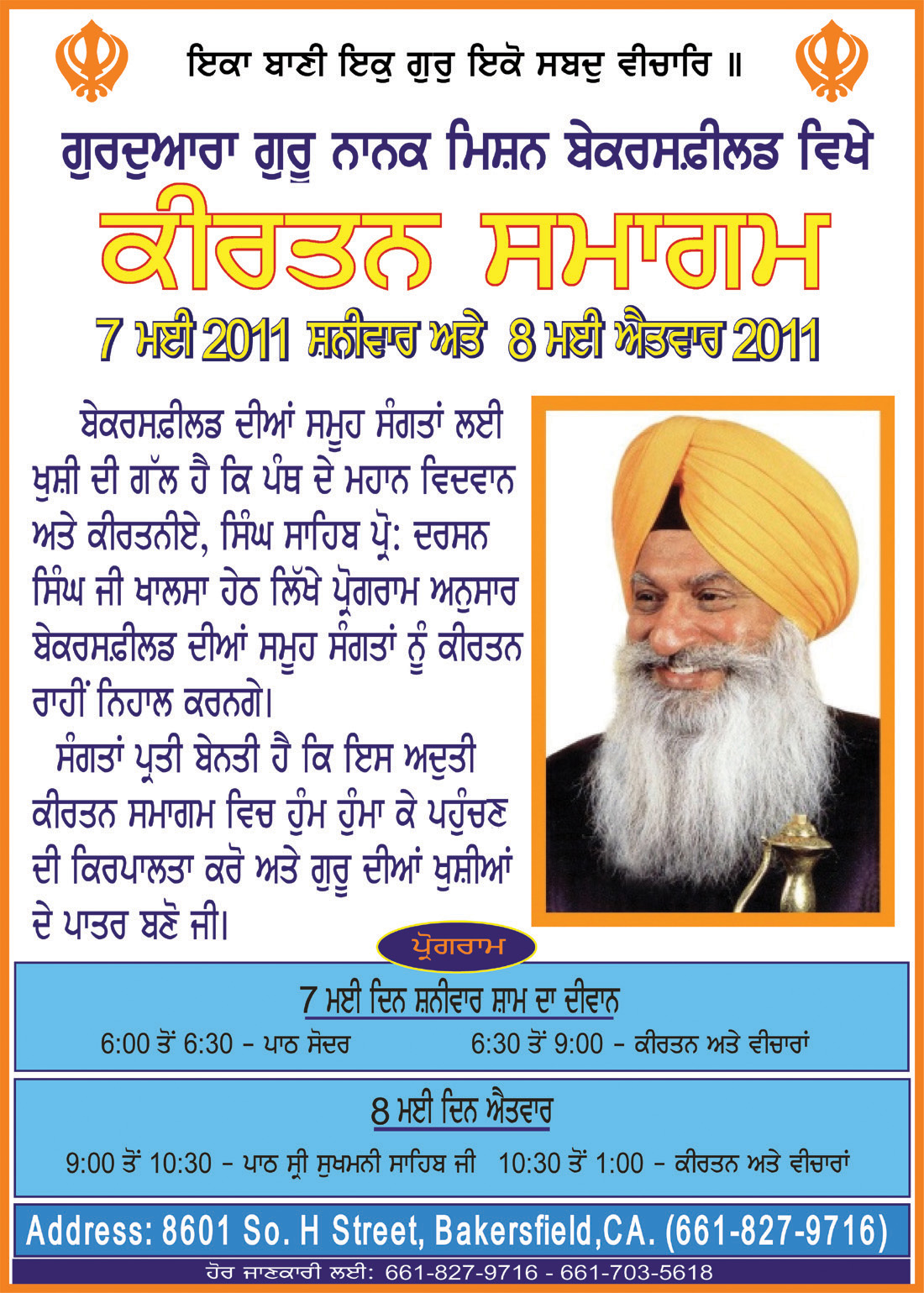 ਪ੍ਰੋ. ਦਰਸ਼ਨ ਸਿੰਘ ਖਾਲਸਾ 7 ਤੇ 8 ਮਈ ਨੂੰ ਗੁਰਦੁਆਰਾ ਗੁਰੂ ਨਾਨਕ ਮਿਸ਼ਨ ਬੇਕਰਸਫ਼ੀਲਡ, ਅਮਰੀਕਾ ਵਿਖੇ ਕੀਰਤਨ ਕਰਨਗੇ