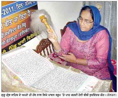 ਕਰਦਿਆਂ ਸੁਖਵਿੰਦਰ ਕੌਰ ਨੇ ਦਸਿਆ ਕਿ ਉਹ ਖ਼ੁਦ ਰੋਜ਼ਾਨਾ ਸਵੇਰੇ-ਸ਼ਾਮ ਦੋ-ਦੋ ਘੰਟੇ ਹੱਥ-ਲਿਖਤ ਬੀੜ