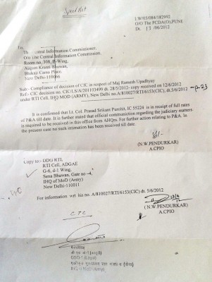 है। जबाव में कहा गया है, ‘लेफ्टिनेंट कर्नल श्रीकां पुरेहित जिनका आईसी
