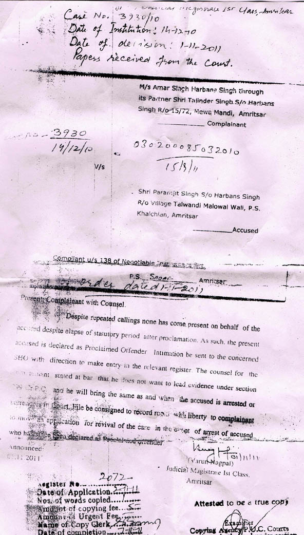ਤਹਿਤ ਭਗੌੜਾ ਘੋਸ਼ਿਤ ਕੀਤਾ ਹੈ, ਕਿਉਕਿ ਉਹ ਅਮਰ ਸਿੰਘ ਅਤੇ ਹਰਬੰਸ ਸਿੰਘ ਵੱਲੋਂ