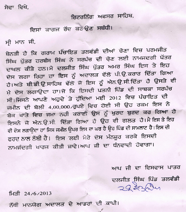 ਇਹ ਦੋਸ਼ ਲਗਾਏ ਹਨ ਕਿ ਪਰਮਜੀਤ ਸਿੰਘ ਪੁੱਤਰ ਹਰਬੰਸ ਸਿੰਘ ਪੰਚਾਇਤੀ ਚੋਣਾਂ ਲਈ