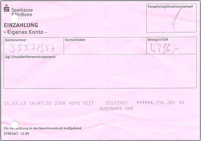 ਗੋਲਕ ਦੀ ਕੁੱਲ ਆਮਦਨ 11.451,- € (ਯੂਰੋ) ਵਿੱਚੋਂ 7.155,00 € (ਯੂਰੋ) ਦੇ