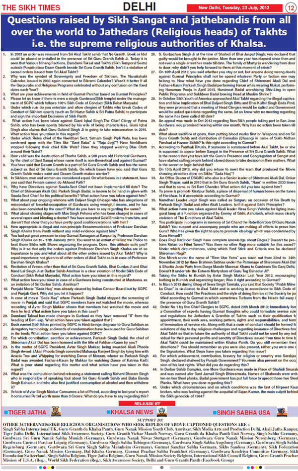 ਕੌਮੀ ਪਤ੍ਰਿਕਾ ਅਤੇ The Sikh Times 'ਚ ਛਪੇ ਅਖੌਤੀ ਜਥੇਦਾਰ ਨੂੰ ਪੁੱਛੇ ਗਏ 45 ਸਵਾਲਾਂ ਦੇ ਲਿੰਕ Viewers may click on the links provided OR click on the images |